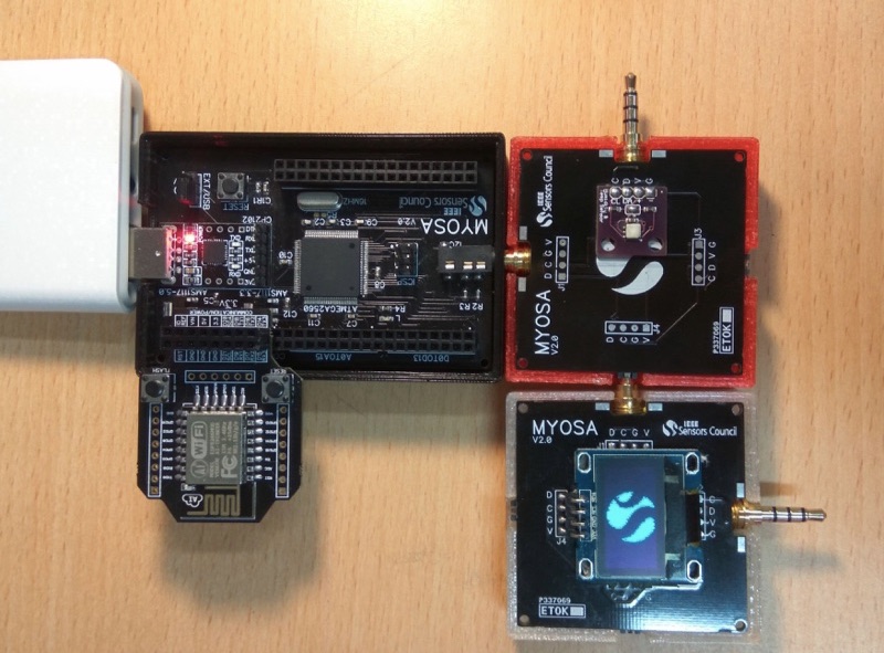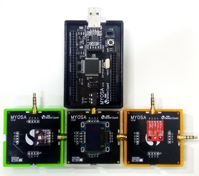 The MYOSA kit has been packaged with the intention of making it attractive to use. The controller board and sensors are housed in 3D-printed semi-transparent boxes. They have been designed and printed by our own team at the Smart City Lab of DA-IICT, India. The top covers are made of transparent acrylic sheets. Different shades of translucent colours make the MYOSA Boards attractive to use. Slots for connections have been made in these housing design for hassle-free plug-and-play action. They provide 360-degree rotation at the connections. The entire design and packaging of MYOSA is very robust and provides great ease of access.